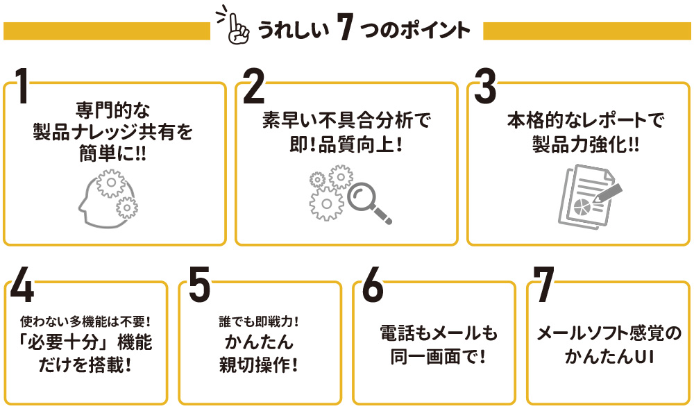 不具合分析レポート活用による品質改善や製品力強化など、モノづくり系企業がサポート業務において共通して抱える課題の解決に最適化しています。 発売以来、テクニカルサポート用に本格的な機能を持ちながらメールソフト感覚で扱える簡単操作、素早く簡単なレポート分析による品質/製品の改善、 的確な対応による対応品質と顧客満足度の向上に貢献し、市販CRMシステムの運用に課題感を持っている、あるいはExcelでの自社管理にとどまっている、 スタートアップなどの比較的小規模のモノづくり系企業から高い評価を頂いております。 |