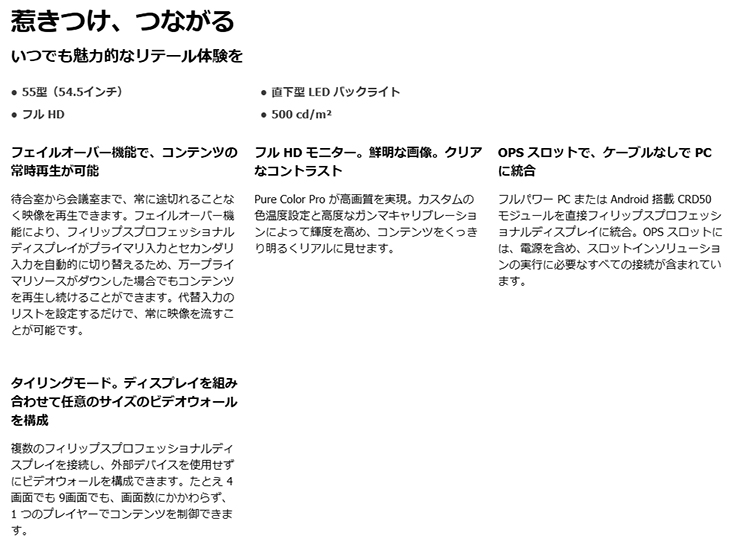 フィリップスビデオウォール 3000 は、24 時間 365 日の連続稼働に対応し、ダイナミックで没入感のあるコンテンツでお客様の関心を引きつけます。